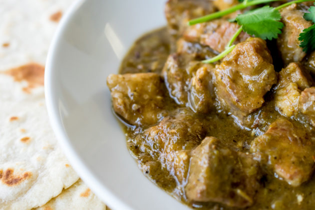 Late last summer there were fresh ones at Sprouts, so I bought a ton, roasted and peeled them and stocked my freezer full. I asked Lori, one of my friends who is from Colorado and is a green chile enthusiast “after I stuff and fry some of these, what should I do with the rest.” She told me about “Green Chile Stew.” Its like a stew/gravy. Lori explained in Colorado they eat it over everything, burritos, stuffed sopapillas, over eggs, hashbrowns, etc. She stated it was also amazing served like a stew with homemade tortillas. I was sold! Lori started me out with a basic recipe (barely any measurements) of literally browning pork, adding flour and the green chiles and simmer with water. I added some spices and made it to an actual recipe. I must say I really am proud of this one. Simmering pork with green chiles (and a couple of spices) are magic together. The spicy smoky flavor of the green chile pairs so well with the tender pieces of pork. After we finished all the pork there was still gravy left, so I reduced it with chicken stock (to make it into a sauce) and made Spinach and Cheese Enchiladas Verde. I suggest you do the same! Oh and don’t forget to serve this New Mexico Green Chile Stew with homemade tortillas.