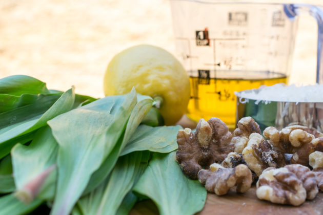 In a food processor, add the ramp leaves, walnuts, Parmesan, lemon zest, and salt. Puree until smooth. While the processor is running slowly stream in the olive oil. Store in the refrigerator or freeze.