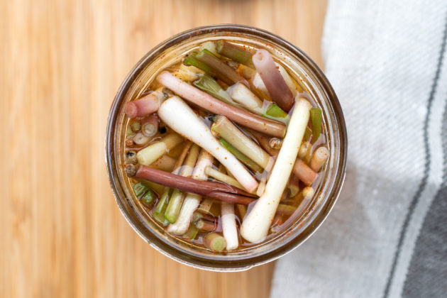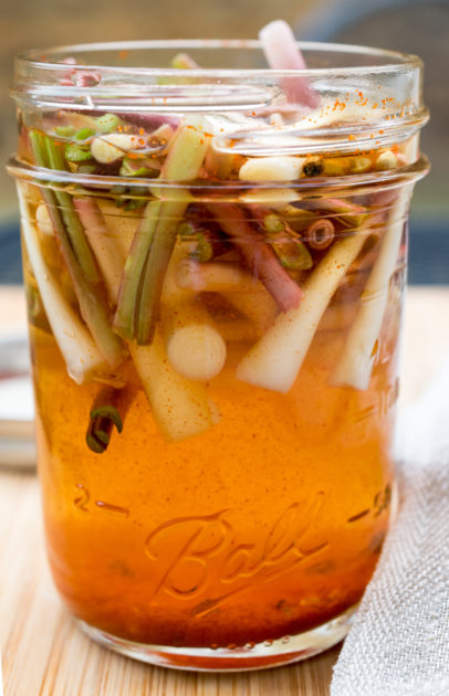 - Combine the vinegar, sugar, salt, gochugaru, and peppercorns in a glass bowl, add the boiling water and stir until the sugar is dissolved. Place the ramps in an 8oz mason jar and pour the hot liquid over the ramps. Cover with a lid and cool. Then refrigerate.