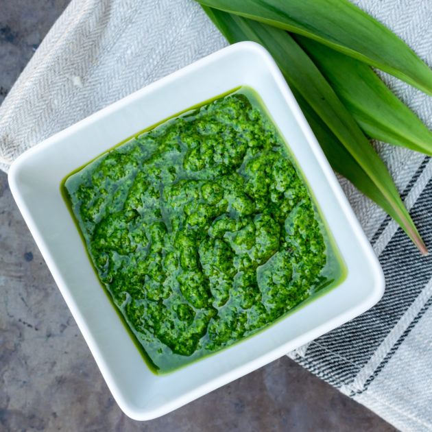 Below are two ramp recipes. They are in season now and if you come across them, buy them. Or else, someone other than you will. My hope is that because of this post when you see them you won’t hesitate to purchase them, because you will already know what to do. Ramps have a pretty strong aroma but are milder and sweeter than onion or garlic, which is why they are in high demand when the season rolls around. Use ramps any place you would onions or garlic. A lot of people pickle ramps because the season is so short and this is a great way to get longevity out of them. Pickled ramp leaves don’t last as long, so I pickled the bottom half (bulbs and stems) and used the leaves in a pesto. The pesto can be tossed with pasta, topped on crusty charred bread, or added to scrambled eggs. The pickled bulbs can be used on pizza, salad dressing, hot dogs, just about any place you want a zing of flavor.